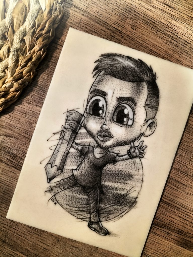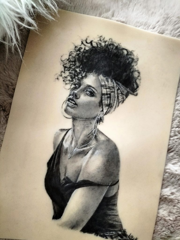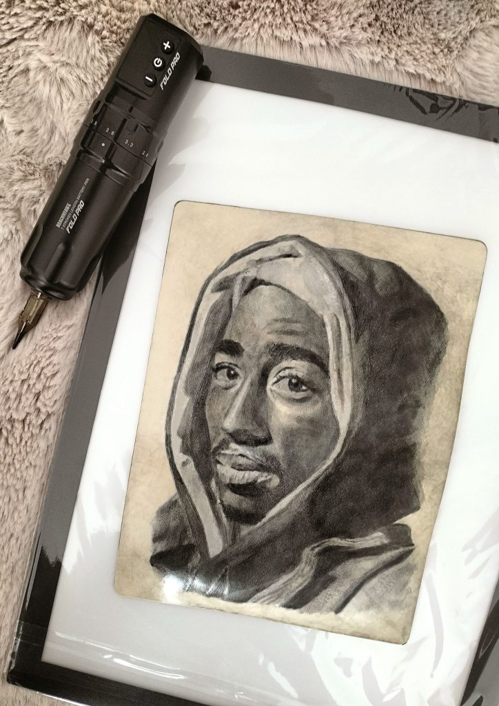Le portrait de la chanteuse Alicia Keys, réalisé avec machine à tatouer rotative DragonHawk Fold Pro sur peau synthétique reelskin format A4.