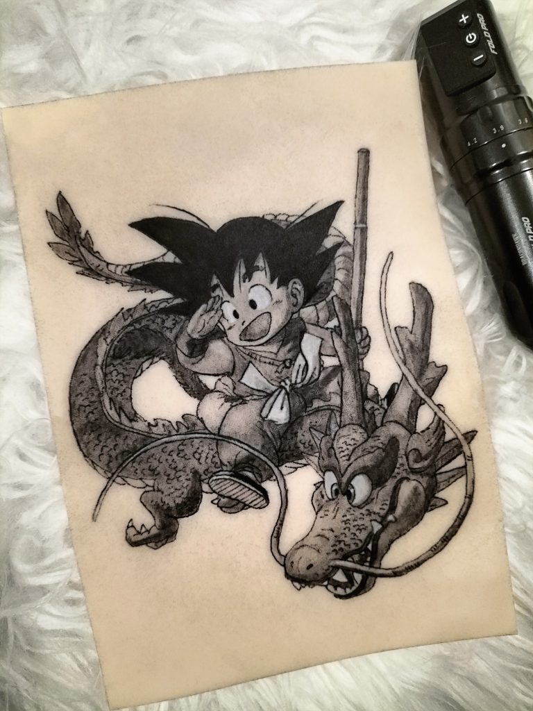 Réalisation des personnages Goku et Shenron de l’univers Dragon Ball, afin de gérer la précision des tracés en fine line et la gestion des aplats en niveau de gris.
