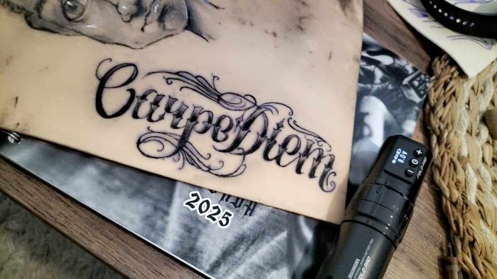 Réalisé sur peau synthétique Reelskin avec machine à tatouer DragonHawk Fold Pro et cartouches RS et magnum de marque Kwadron. 7 heures de boulot. (2025)