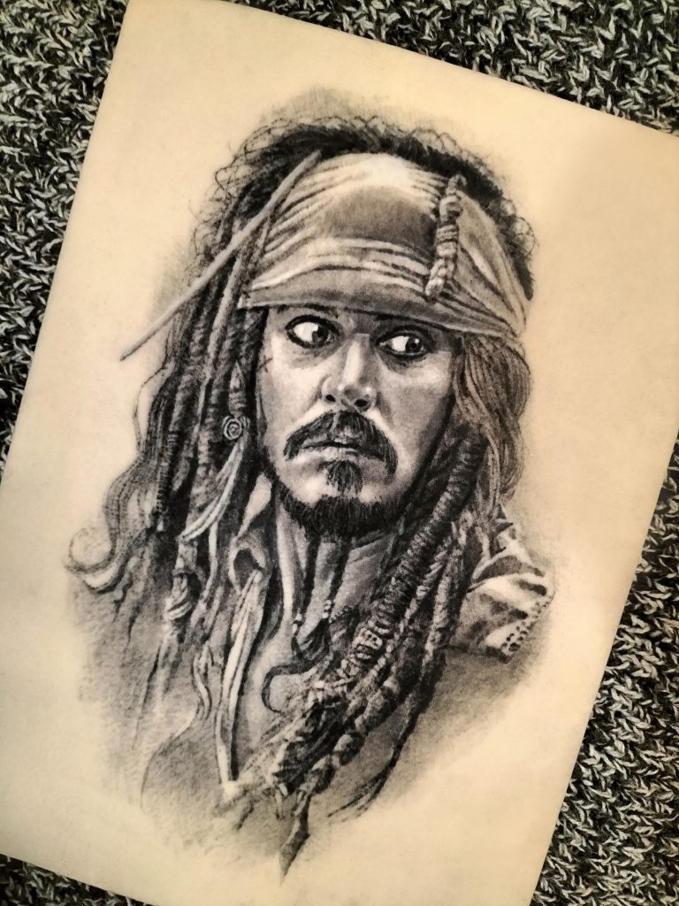Portrait de l’acteur Johnny Depp dans son rôle du capitaine Jack Sparrow dans Pirates des Caraïbes.