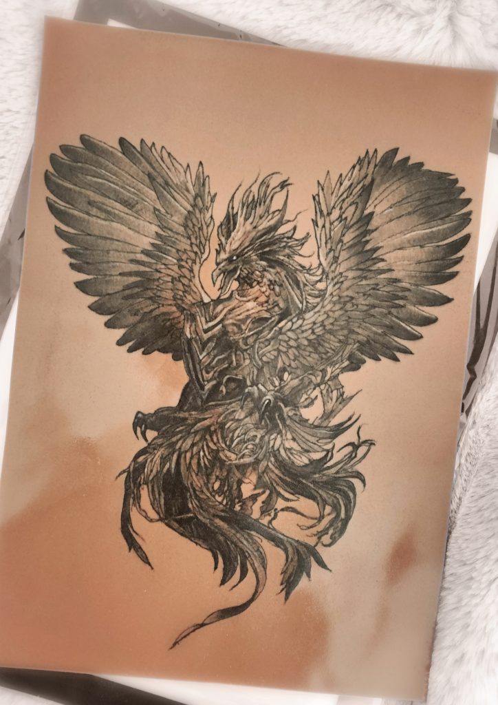Phénix réalisé sur peau synthétique mate, 7 heures de boulot (2024)